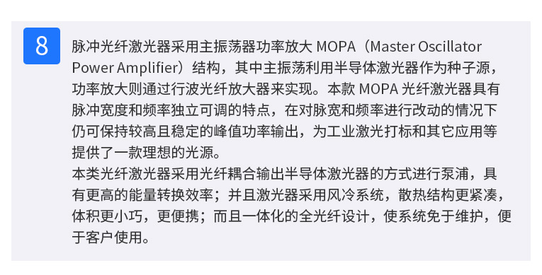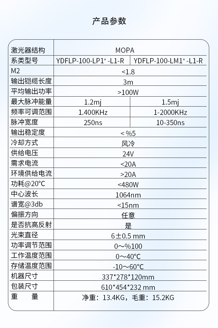 通發(fā)激光TFL-80SW振鏡激光焊接機,采用主振蕩器功率放大 MOPA(Masrer Qscillator Power Amplifier)結構,實現(xiàn)脈沖寬度和頻率獨立可調(diào)的特點,在對脈寬和頻率進行改動的情況下仍保持較高且穩(wěn)定的峰值功率輸出,適用于電池、小五金等多個行業(yè)的激光打標、激光焊接應用。